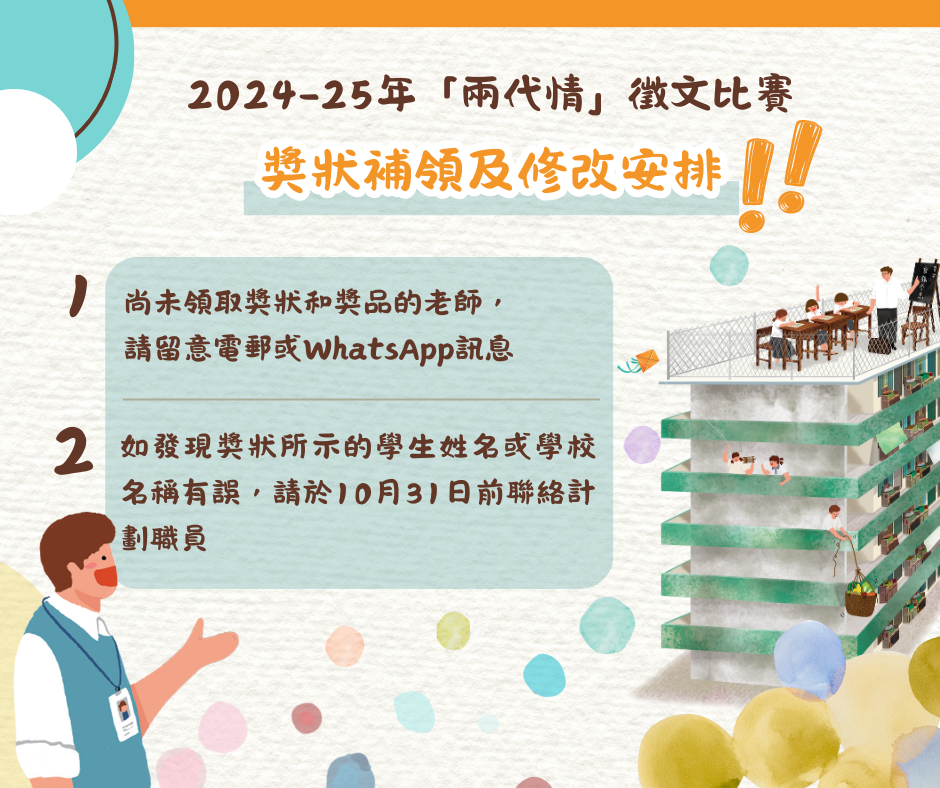 2024-25年「兩代情」徵文比賽獎狀補領及修改安排!