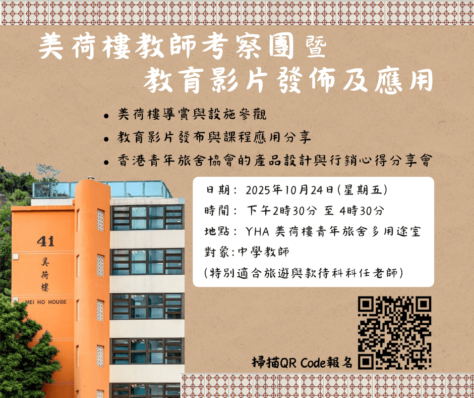 香港旅遊和住宿業界發展日新月異。為了讓旅遊與款待科老師對業界有更深入的認識,並加強教學內容,香港青年旅舍協會聯同香港學界旅遊與文化協會合辦美荷樓教師考察團 暨 教育影片發佈及應用活動,誠邀中學教師,特別是旅遊與款待科老師出席。